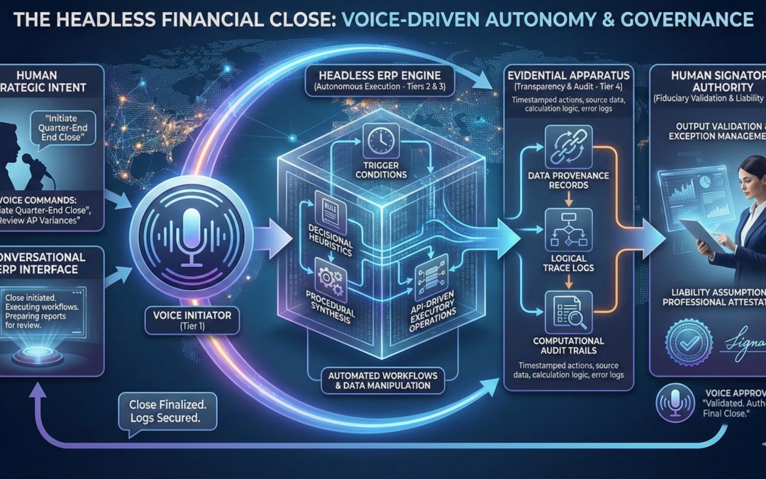 If the Headless ERP is the body, the Conversational ERP is the voice. This interface allows the Human Initiator to drive the financial close using natural language. This is not merely a “chat box”; it is a command-and-control system where voice triggers the autonomous logic of the firm.